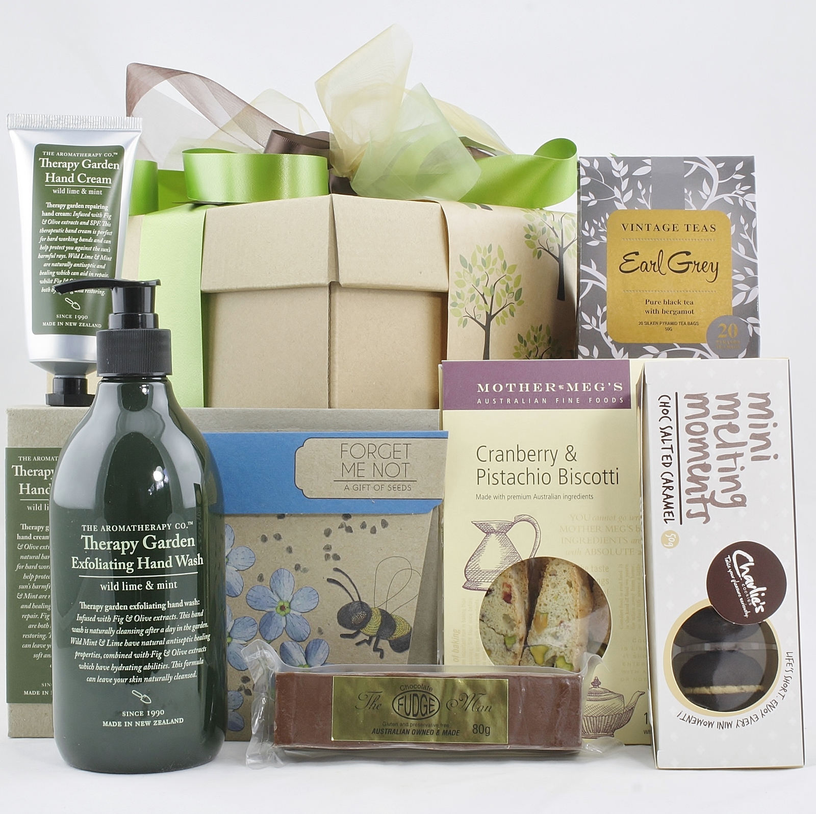 The AromaTherapy Co. Therapy Garden Pumice Wash, Wild Mint & Lime 500ml pump bottle – Scrub up with this exfoliating wash, leaves hard working hands rejuvenated after a day in the garden. The AromaTherapy Co. Therapy Garden Hand Cream Wild Mint & Lime 100ml – ideal remedy for tired and hard working hands Sow ‘n Sow Organic Seeds – Forget Me Not…the gift of seeds, sweet, tiny blue cottage garden flowers that are easy to grow and flower in late winter to early spring. Mother Megs Pistachio & Cranberry Biscotti 120g – great with a cup of tea or coffee. Charlies Cookies and Cream Melting Moments 45g The Fudge Man chocolate fudge 80g Vintage Tea’s Pure Ceylon Earl Grey Tea – 20 silk tea bag sachets Your gifts are beautifully presented in a gift box with lid, adorned with matching organza ribbons. Giftcard attached