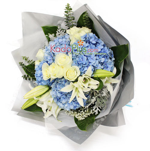 white lilies, 10 white roses, blue hortensias, fillers and greens wrapeed in a luxuriour papers.