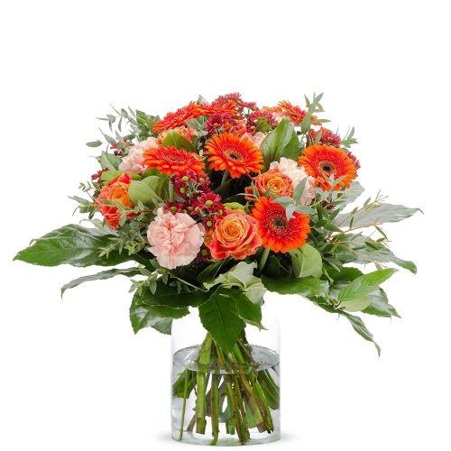 A beautiful bouquet in warm colors with fresh complementary green. Vase not included as standard.