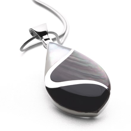 A classy teardrop inset with three canvases of white mother of pearl, black mother of pearl and onyx divided by a silver swirl. Your slightest move reveals pearly shimmers of light that flash beneath the surface. Enchanting! Size: 55x26mm (inc loop). Includes 40cm snake chain. Longer chains available.