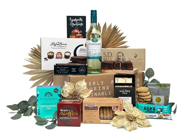 Presented in a Large Magnetic Hamper Valise Case Decorated in Luxury Satin Ribbon Greetings Card for your Personalised Message | Christmas Foods Red Velvet Cake 400g Very Fruity 6pk gf Mince Pies 400g Gourmet Foods Original Irish Oat Cookies Kilbeggan 200g Graham's Traditional Irish Shortbread 135g Peanut Butter & Milk Chocolate Dates Forest Feast 140g Swiss Lemon Biscuit with Ginger & Chia Rhythm 108, 135g Creamy Caramel & Sea Salt Chocolate Discs Lily O'Brien's 120g Real Fruit Jellies Pandora Bell 150g Chocolate Cherries 40g Kestrel Foods