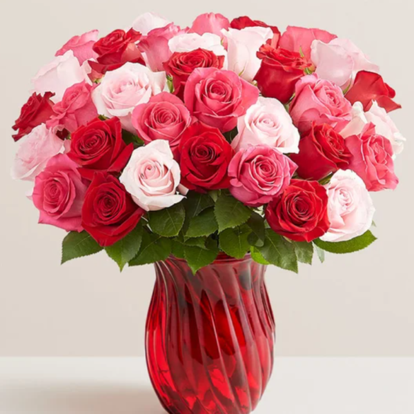 - Bouquet of red, light-pink, and hot-pink roses; 36 stems in all with vase