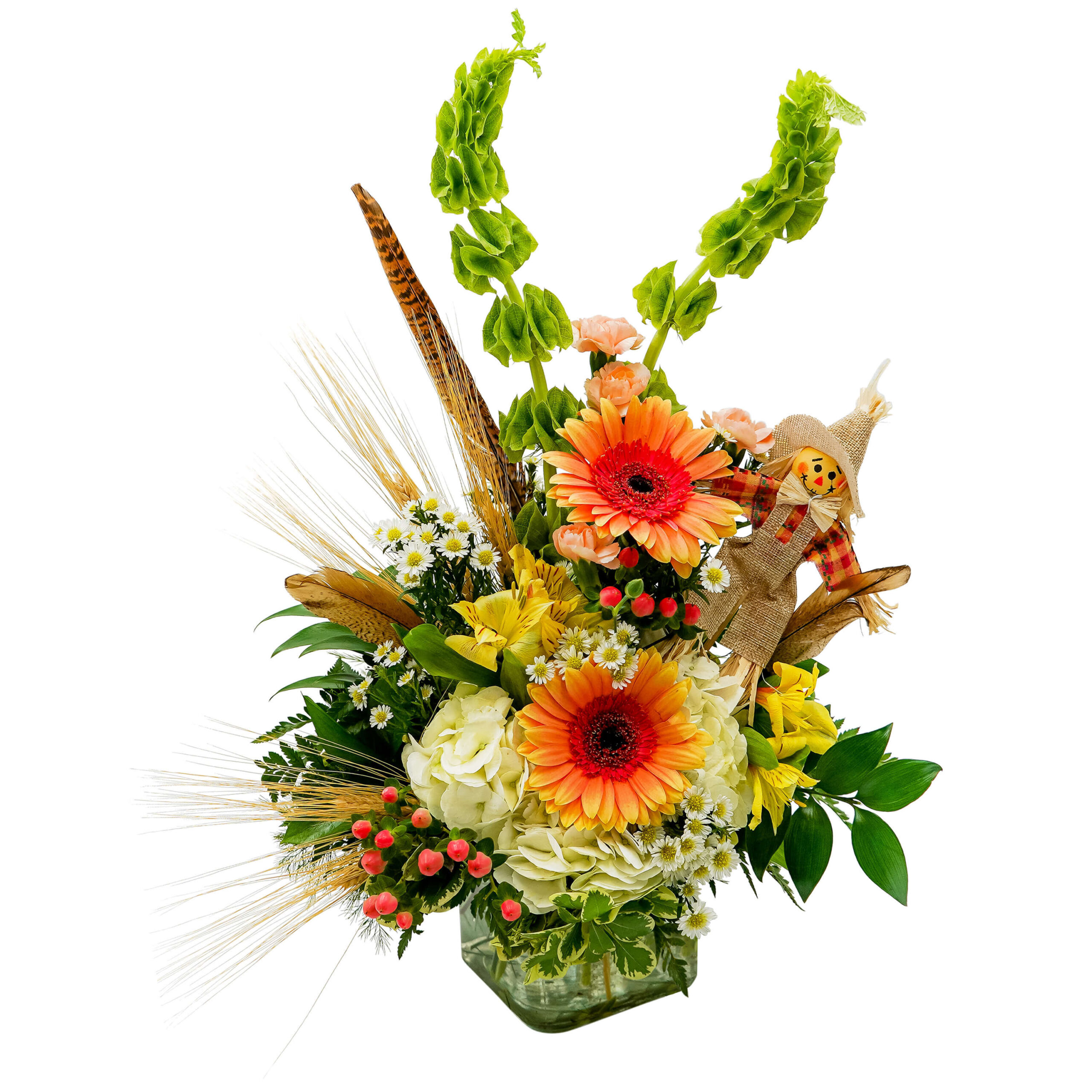 Field of Dreams. Farmer’s Field sports a cute scarecrow to watch over the crops. Beautiful flowers like daisies, Bells of Ireland, and alstroemeria are in cube vase.