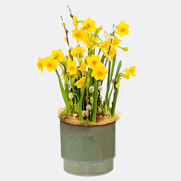 Gorgeous arrangement with one yellow daffodil , moss and light yellow sisal to cover up and willow catkins in a nice ceramic pot (approx. 13.5 cm).
