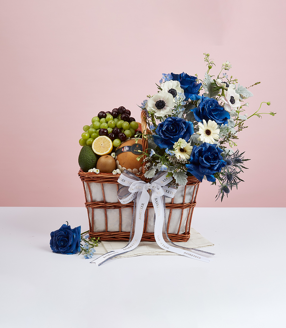 Fresh Fruit & Blue Tone Flower Gift Basket