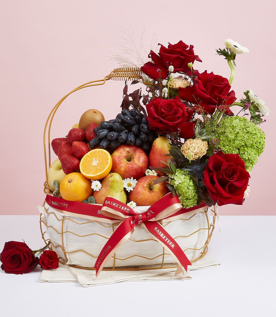 Fruit and flower gift baskets It’s a gift basket that Brezzegifts has arranged and designed beautifully. There is the brightness of the flowers that we have brought flowers imported from Ecuador to decorate in bright colors. Which looks lively, looks fresh, and the colors of imported fruits that we carefully select are of good quality and are appetizing. which is a gift basket suitable for all occasions and all genders and ages Explorer Roses, Imported Roses From Ecuador / 4 Stems