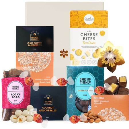 Signature Edible Blooms Hamper delivery box and packaging including a free gift card