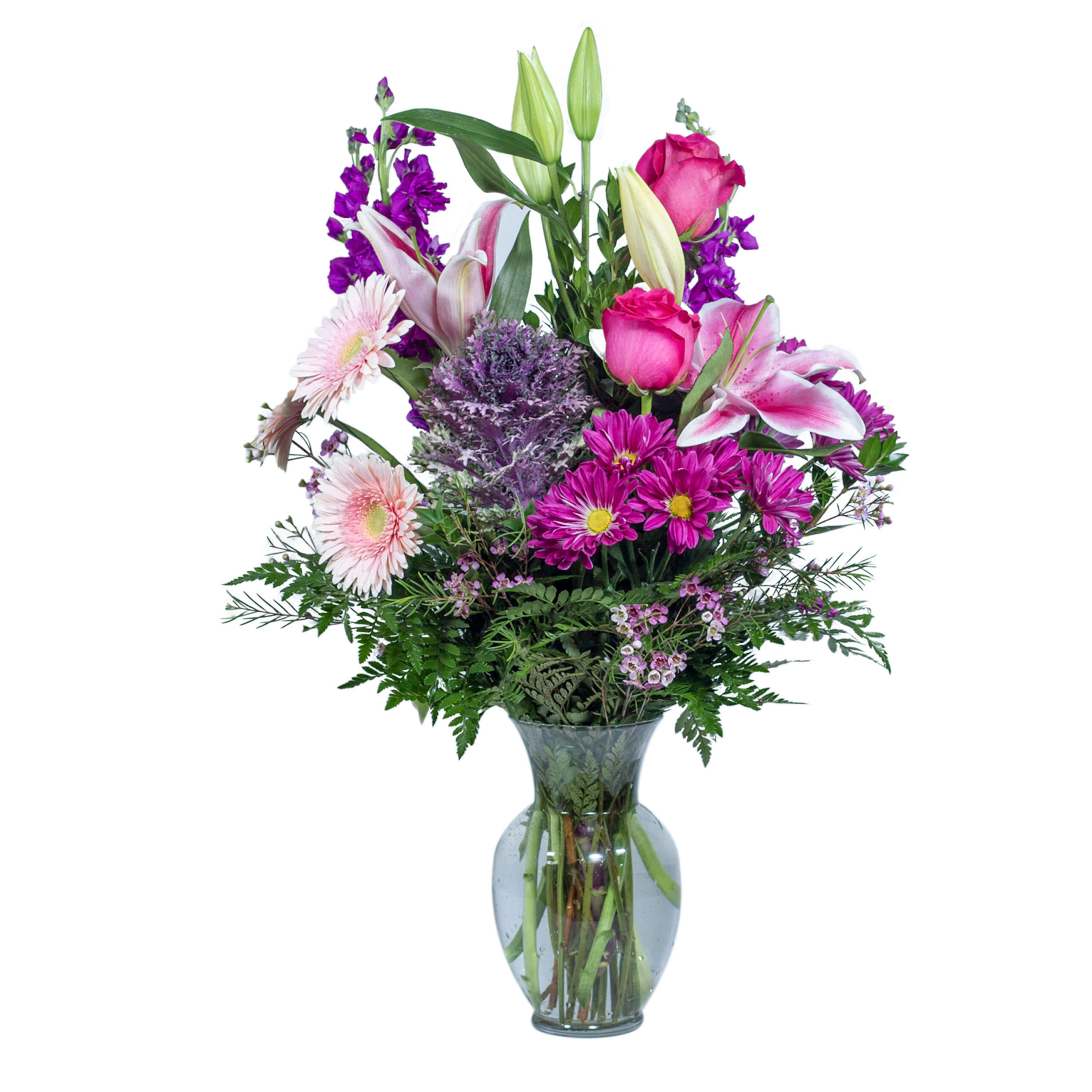 Believe you Can. Inspired by You will let them know they can reach the stars. Stargazer lilies, Gerbera daisies, and purple stock are highlighted in a clear glass vase.
