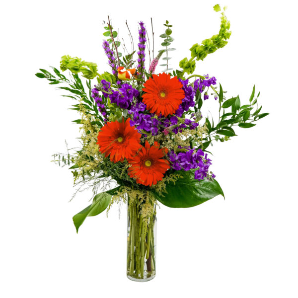 Orange You Glad to know them? Three orange flowers like Gerbera Daisies are highlighted in this vibrant arrangement. Approximately 24″W X 24″H