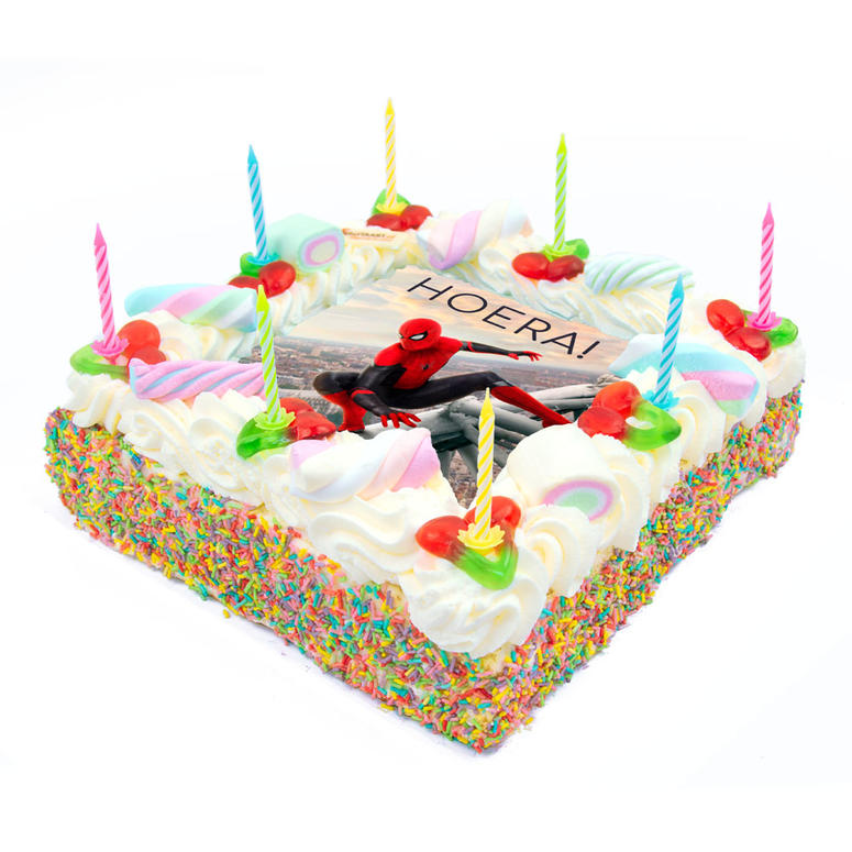What could be more fun for a Spiderman fan than a Spiderman cream cake for a birthday or children’s party! The Spiderman cake is not only beautiful to look at, but also delicious to eat. The whipped cream is soft and airy and the cake tastes perfect. The cake is always freshly prepared and is decorated with bacon, candies and candles and filled with delicious creamy whipped cream. If you want, you can edit the image on the cake and add your own text. This way you can surprise the birthday boy/girl with this beautiful and delicious whipped cream cake. Young and old will thoroughly enjoy this Spiderman cake.