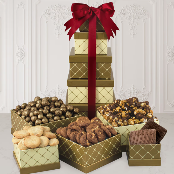 - Tower of five crisscross golden gift boxes