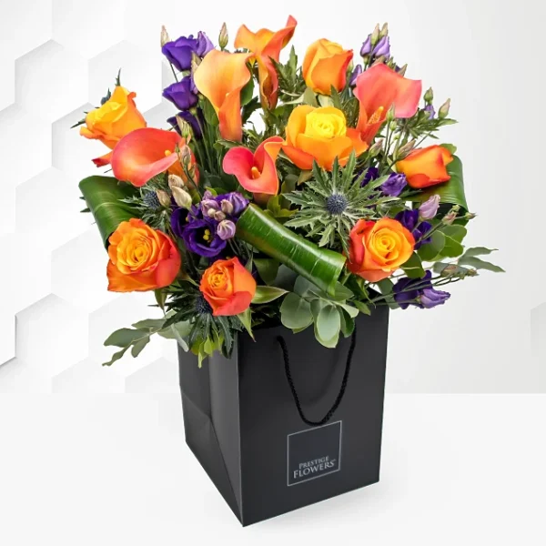 | Content | A gorgeous admirable bouquet from our Prestigious Luxury Range. Embraced within this dexterous arrangement are very rare mango orange callas and roses with complementary blooms, thistles and aspidistra making this one of our most extraordinary bouquets. Our Tikal arrangement comes displayed with a custom Prestige Luxury Collection bag. The bouquet is available for UK next day delivery. Vase not included* (Medium bouquet shown) | Enticing sweetness This beauty captivates and charms thanks to hot cerise roses surrounded by bewitching blooms in pink and lilac. Stems of phlox, clematis and veronica create texture that simmers on the edge of effervescence. In the box arrange our sensational Fuschia Allure bouquet by hand with the following fresh flowers: Lilac roses, pink phlox, cerise rose, pink stock, lilac clematis, purple veronica fountain eucalyptus and pistache foliage. | Seasonal perfection Nothing has spring charm quite like the tulip. Satin soft cups in an array of colours open into bowls of joy and wonder for the recipient at every moment. In the box arrange our sensational Spring Bliss bouquet by hand with the following fresh flowers: 40cm mixed tulips. | In your thoughts Our 'Distant Embrace' bouquet is a symphony of pink and yellow dancing through pops of red and purple. Each bloom tells a tale of a lasting bond and fond memories, bridging distances with its vibrant hues and tender blossoms. This flower arrangement is more than a gift; it's love wrapped in nature's splendour. Let this vibrant creation brighten their day, bringing a touch of elegance and a heartfelt message that transcends miles. In the box assemble this gorgeous luxury bouquet with the following beautiful blooms: Pink roses, yellow roses, red hypericum, purple veronica, irises, solidago, and salal foliage. | Sunny idyll Like the perfect spot where the softest wind sweeps freshness over the sun's warm rays, the Gold Oasis is a haven of balmy tranquility. Clementine tulips, radiant craspedia and solidago spill a joyous glow across lilac asters and statice. Our letterbox flowers make a wonderfully hassle-free and thoughtful gift, designed for most standard letterboxes to ensure delivery. In the box This arrangement contains the following: Orange tulip, solidago, lilac statice, craspedia and lilac asters. | Blushing blooms Send someone a soothing embrace captured in flowers. The monochrome palette of pinks envelopes the heart with love. Perfect for showing someone how much you cherish them. Our letterbox flowers make a wonderfully hassle-free and thoughtful gift, designed for most standard letterboxes to ensure delivery. In the box This arrangement contains the following: Cerise dianthus barbatus, pink santini, lavender antirrhinum, pink limonium, pink rose and pistache foliage. |