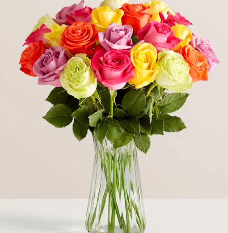- Bouquet of 24 multicolored roses with vase; colors may vary based on availability