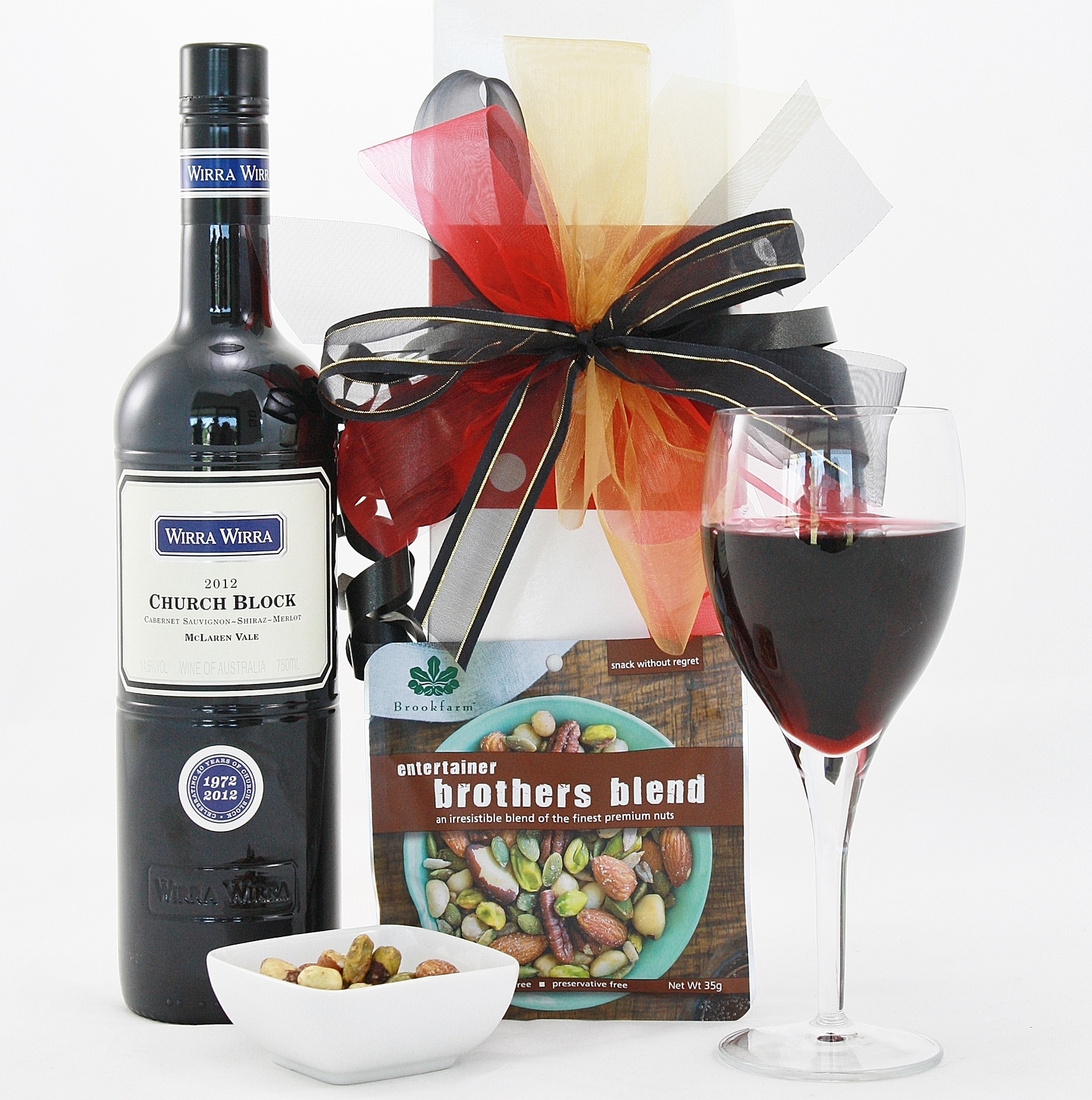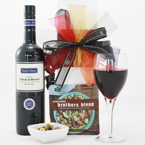 | Content | Wirra Wirra Church Block Australian Shiraz Cabernet 750ml Brothers Blend premium nut mix 35g Presented in a glossy giftbox with ribbons, trimmings & personalised giftcard | Australias Own Byron Bay Premium Lager together with these savoury treats, it's the perfect gift. 2 x Byron Bay Premium Lager 355ml Carrs Table Water Crackers 125g Red Rock Deli Sea Salt Chips 90g Rosenborg Camembert Cheese 125g Scattered Chocolate Truffles Presented in a glossy gift box with ribbon and attached gift card. Refreshing and Unique! | Wolf Blass Sparkling Cuvee professionally packed with fine chocolates. Wolf Blass Sparkling Pinot Noir Cuvee 750ml Assortment of Gourmet Italian Chocolate Truffles Professionally Packaged in a Timber Wine Box with Ribbon & Gift Card. A great affordable gift hamper that is sure to impress! | A delightful gift hamper with bubbles and plenty of chocolates to enjoy! Wolf Blass Eaglehawk Sparkling Cuvee Brut 750ml Surrounded by a Selection of Gourmet Italian Milk Chocolates Presented in a Stylish Gift Basket Professionally Shrink Wrapped with Gift Card & Ribbon. A gift that is suitable for all tastes and is ready to be enjoyed! | A rich deep red with an assortment of Italian chocolates. Wynns Coonawarra Estate 750ml Assortment of Fine Italian Milk Chocolate Truffles Presented in a Glossy Wine Box with Ribbon & Attached Gift Card Such a nice drop for that red wine lover! | A smooth, rich Shiraz with the finest Italian chocolate truffles. Premium Three Steps Hunter Valley Shiraz 750ml 20 x Finest Italian Wittors Milk Chocolate Truffles Presented in a Quality Storage Basket Professionally Shrink Wrapped with Gift Card & Ribbon The perfect way to say thank you or show you care with this smooth & rich gift basket! |
